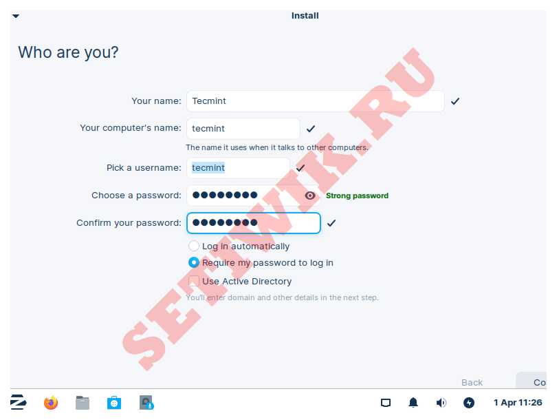 Введите данные пользователя. Использование слабого пароля разрешено, но не рекомендуется.