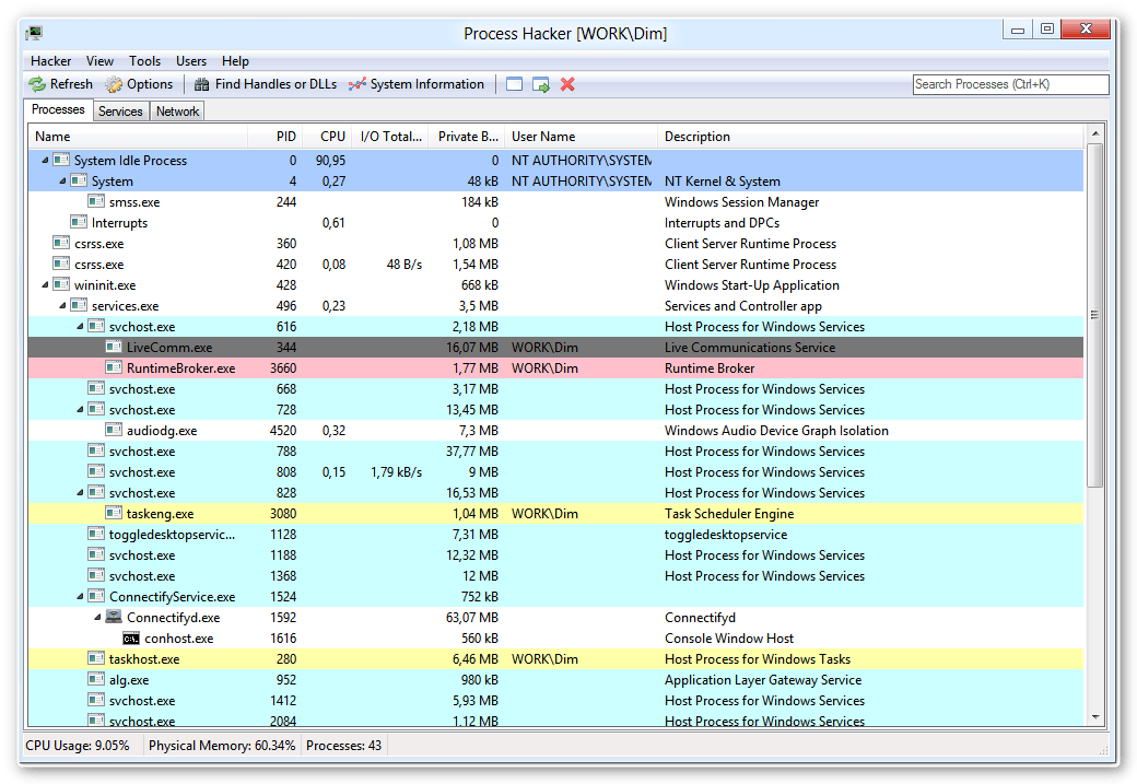 Process Hacker является свободным многофункциональным инструментом для мониторинга и управления процессами и службами, работающими на вашем компьютере. Он предлагает практически все те же функции, что и Process Explorer, но имеет и некоторые дополнительные особенности.
