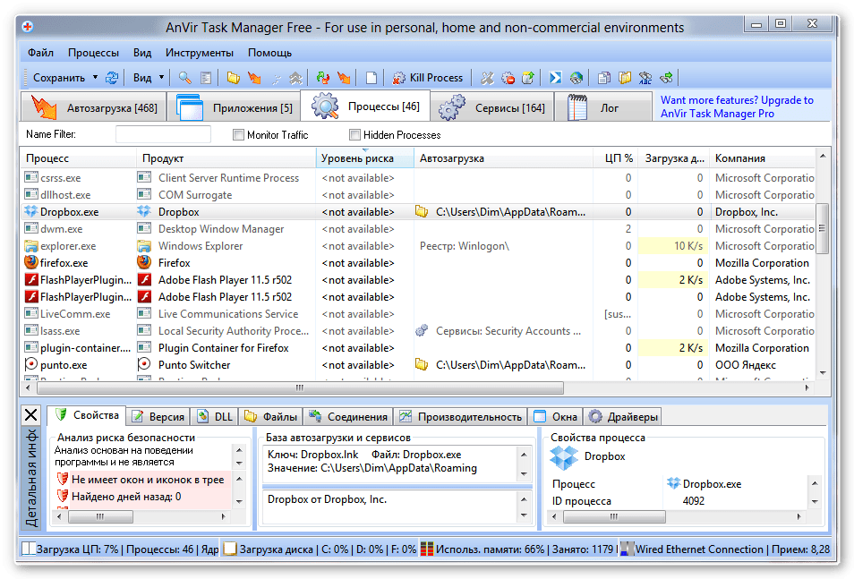 Это одна из самых известных и популярных программ в своем классе. Хотя на сайте имеется довольно дорогостоящая AnVir Task Manager Pro, можно с уверенностью сказать, что функциональности даже бесплатной версии с головой хватает для успешного применения в большинстве случаев. Так, здесь имеется полная информация о запущенных приложениях, процессах и библиотеках, открытых сетевых соединениях с возможностью приостановки или быстрого завершения любого выбранного вами элемента. Очень полезной является возможность управления списком автозагрузки, в том числе и установленными расширениями для браузера Internet Explorer. При этом программа умеет отслеживать и предупреждать пользователя обо всех изменениях в составе автоматически запускаемых программ, что поможет ему вовремя обезвредить зловредные или просто не нужные элементы, втихую пытающиеся прописаться на вашем компьютере.