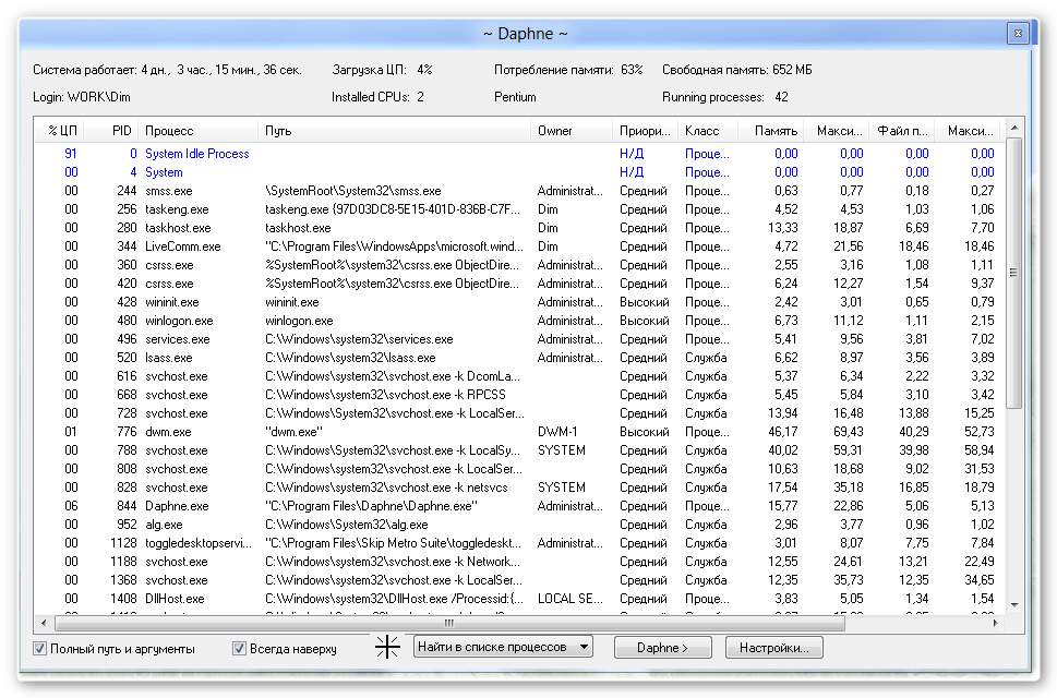 Это бесплатная утилита, которая работает в системном трее и позволяет управлять процессами в ОС Windows. В начале своего развития программа Daphne разрабатывалась прежде всего как удобный инструмент «убийства» зависших процессов, однако потом она обзаводилась все новыми функциями и на сегодняшний день представляет собой полноценный менеджер задач.