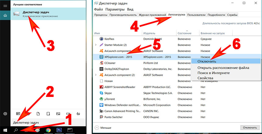 - На самом верху нажмите на раздел «Автозагрузка». Здесь увидите все утилиты, которые автоматически запускаются при включении компьютера. Ваша задача нажать правой клавишей мыши на приложение, которое желаете убрать из автозагрузки и выбрать самую первую строку «Отключить».