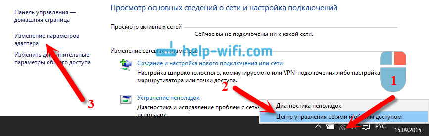 Нажимаем правой кнопкой мыши на статус соединения с интернетом, на панели уведомлений и выбираем пункт Центр управления сетями и общим доступом. Дальше, нажмите в новом окне на пункт Изменение параметров адаптера.
