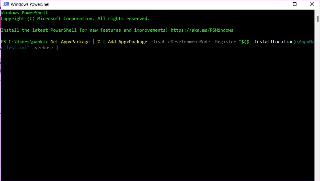 Get-AppxPackage | % { Add-AppxPackage -DisableDevelopmentMode -Register «$($_.InstallLocation)\AppxManifest.xml» -verbose }