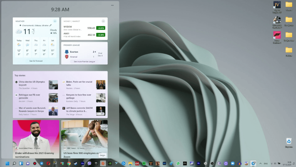 В Виндовс 11 также добавили виджеты и ленту новостей. Всё это вызывается одной кнопкой на Панели управления или сочетанием клавиш Win+W. При её нажатии с левой стороны экрана появляется окно средних размеров. На нём есть набор виджетов, которые можно менять по усмотрению пользователя (погода, акции, календарь, спортивные результаты и т.д.), а также лента новостей. Последняя подбирается под интересы пользователя интеллектуальным способом и чем чаще смотреть здесь новости, тем точнее она выдает предпочтения.