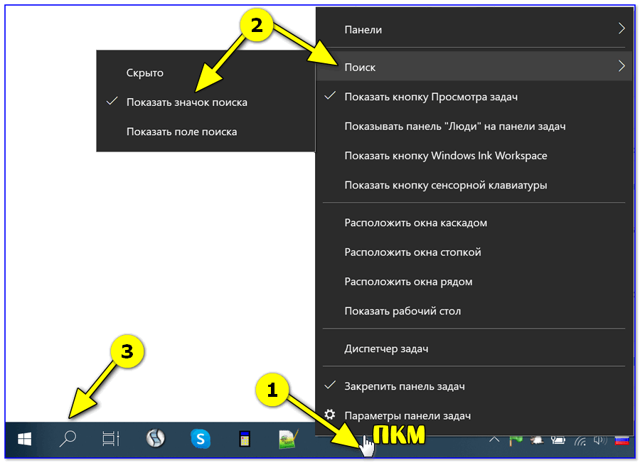 Если значок «Лупы» (или поисковой строки) вовсе не отображается на панели задач — нажмите по ней в свободном месте от иконок правой кнопкой мыши, и в появившемся меню раскройте вкладку «Поиск» — поставьте галочку рядом с «Показать значок поиска» .