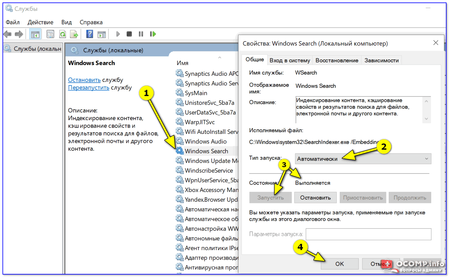 В списке служб найдите Windows Search и откройте ее. Во вкладке «Общие» у службы должен стоять автоматический тип запуска, состояние — «Выполняется» . Если это не так — исправьте настройки (как нужно сделать — показано на скрине ниже) .