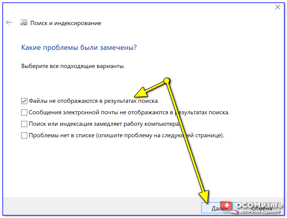 Следом отметить галочками проблему (например, «Файлы не отображаются в результатах поиска») и нажать по кнопке «далее». Мастер проверит вашу систему на проблемы и ошибки, и, если они будут найдены — устранит их!