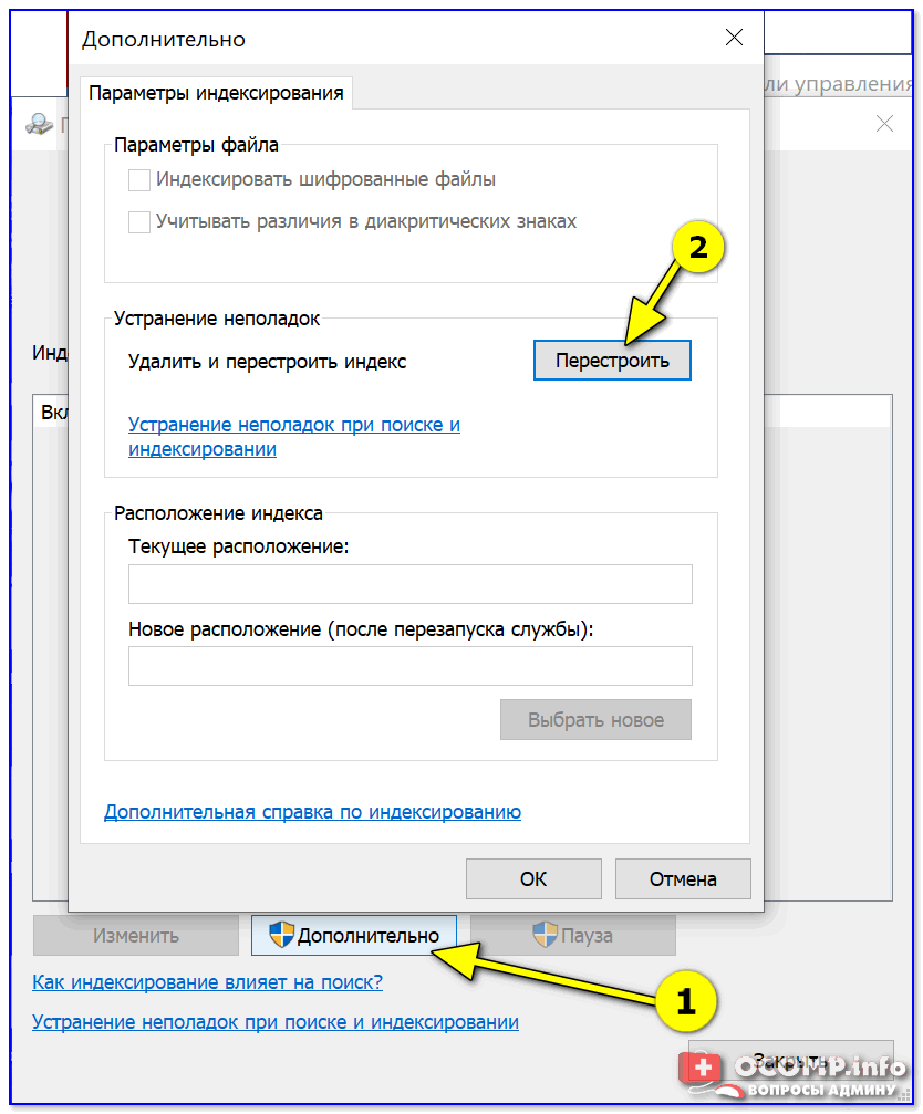 Чтобы перестроить поисковый индекс, откройте Панель управления> Система и обслуживание> Параметры индексирования. В расширенных параметрах нажмите «Восстановить значения по умолчанию», а также «Восстановить индекс». Щелкните ОК.