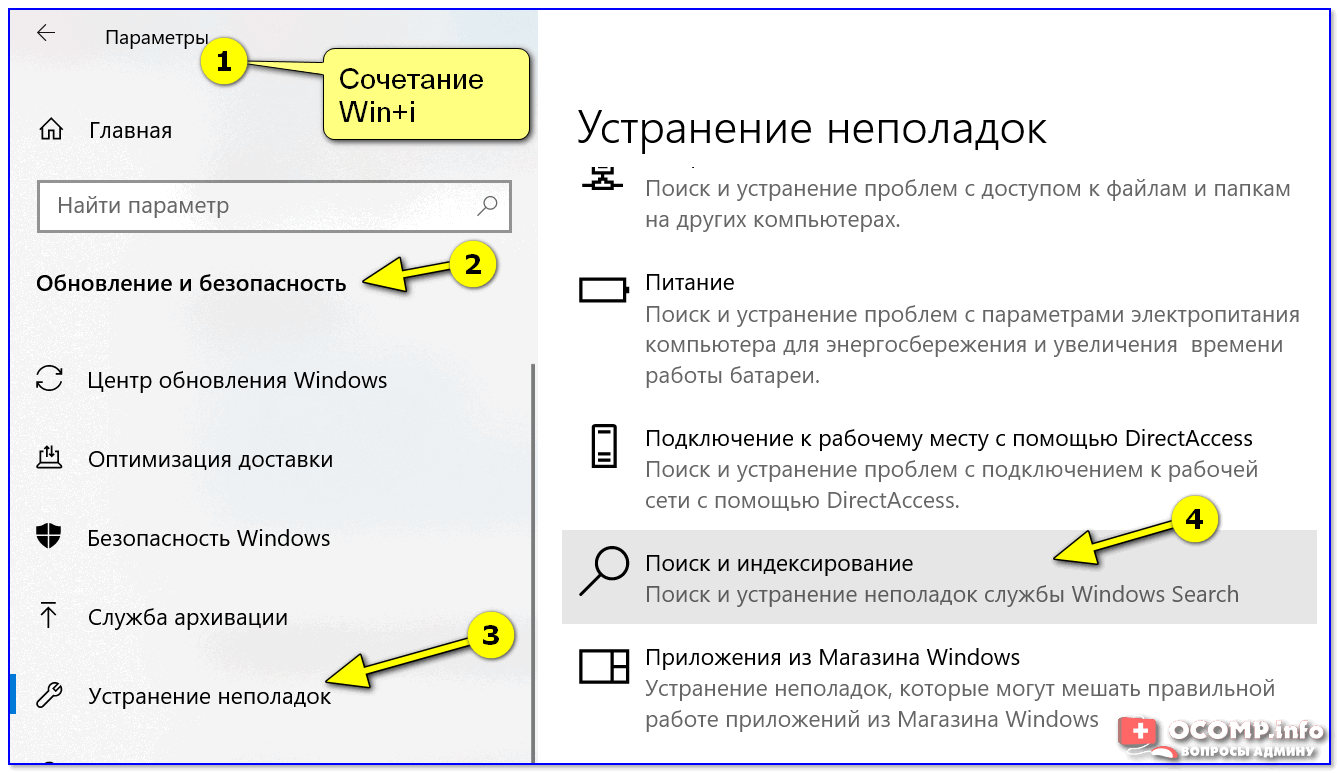 Чтобы его запустить — необходимо открыть параметры Windows (сочетание клавиш Win+i), перейти во вкладку «Обновление и безопасность / устранение неполадок» и кликнуть по инструменту «Поиск и индексирование» .