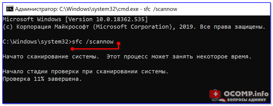 Следующее, что нужно проверить — это целостность системных файлов. Для осуществления этой операции — понадобиться запустить командную строку от имени администратора (нажмите Ctrl+Shift+Esc чтобы открылся диспетчер задач — в нем нажмите по «Файл/новая задача» и используйте команду CMD) .
