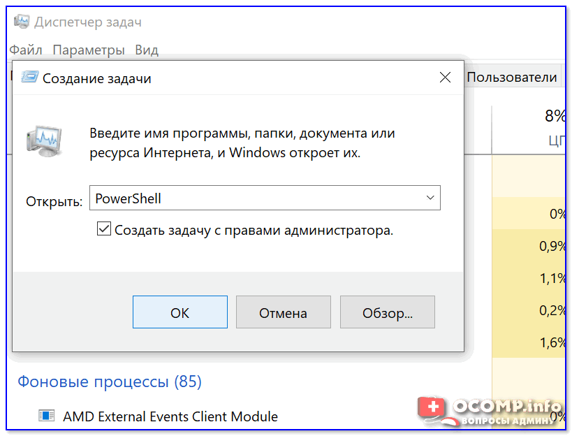 Можно попробовать перерегистрировать кнопку ПУСК и панель задач (т.е. откатить их к исходным настройкам) с помощью спец. команды в оболочке PowerShell. Запустить ее нужно от имени администратора: для этого откройте диспетчер задач и воспользуйтесь меню «Файл/новая задача». См. скриншот ниже.