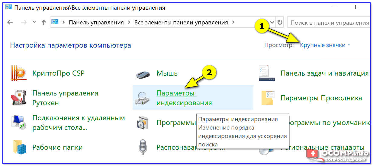 Делается это достаточно просто: сначала нужно открыть панель управления, переключить отображение на «Крупные значки» и перейти во вкладку «Параметры индексирования».
