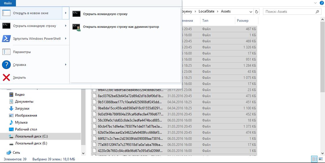 1. Убедитесь, что Windows 10 на вашем компьютере отображает скрытые файлы и папки. Чтобы проверить это, откройте Проводник и кликните по вкладке Вид. Напротив пункта Скрытые элементы должна стоять «галочка». 2. Через Поиск перейдите по адресу %userprofile%\AppData\Local\Packages\Microsoft.Windows.ContentDeliveryManager_cw5n1h2txyewy\LocalState\Assets Вы попадете в папку Assets с большим числом файлов. 3. Скопируйте все файлы в отдельную папку и разместите её в удобном для вас месте — например, на рабочем столе. 4. В новой папке нажмите Файл — Открыть командную строку — Открыть командную строку как администратор.
