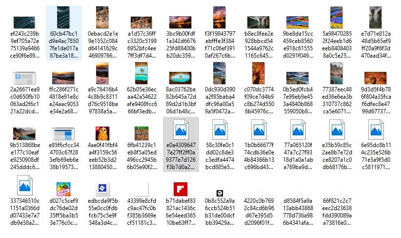 Все эти файлы представляют собой изображения, но без расширения, и для их просмотра к окончанию файла следует добавить его расширение — jpg. Отсутствие этих символов — причина того, почему поисковик Windows 10 не смог обнаружить графические файлы, используемые в ней как фоновые рисунки для экрана блокировки.