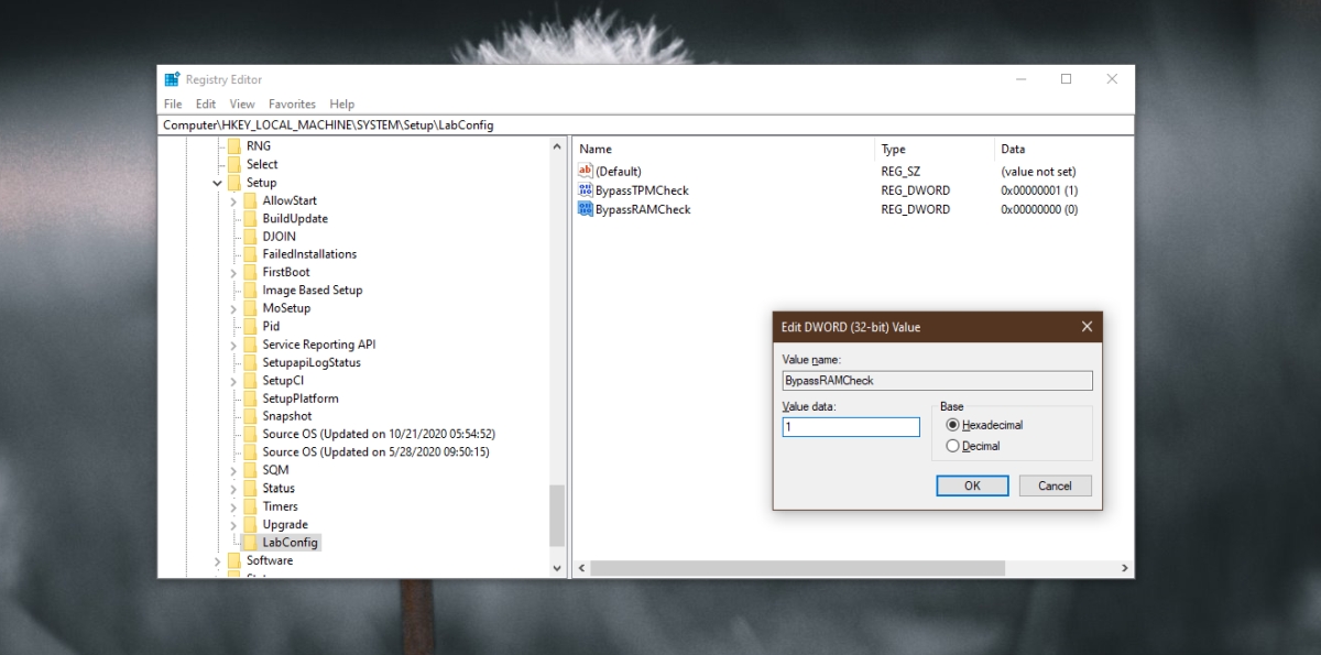 Щелкните правой кнопкой мыши раздел LabConfig и выберите Создать> DWORD (32-битное) Значение из контекстного меню. Назовите это значение : BypassRAMCheck Дважды щелкните BypassRAMCheck и установите для него значение 1.
