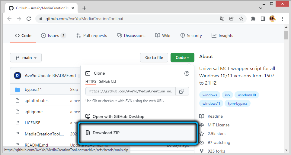 Скачиваем батник с официального сайта разработчика (жмём кнопку Code, в появившемся перечне выбираем пункт «Download ZIP»).