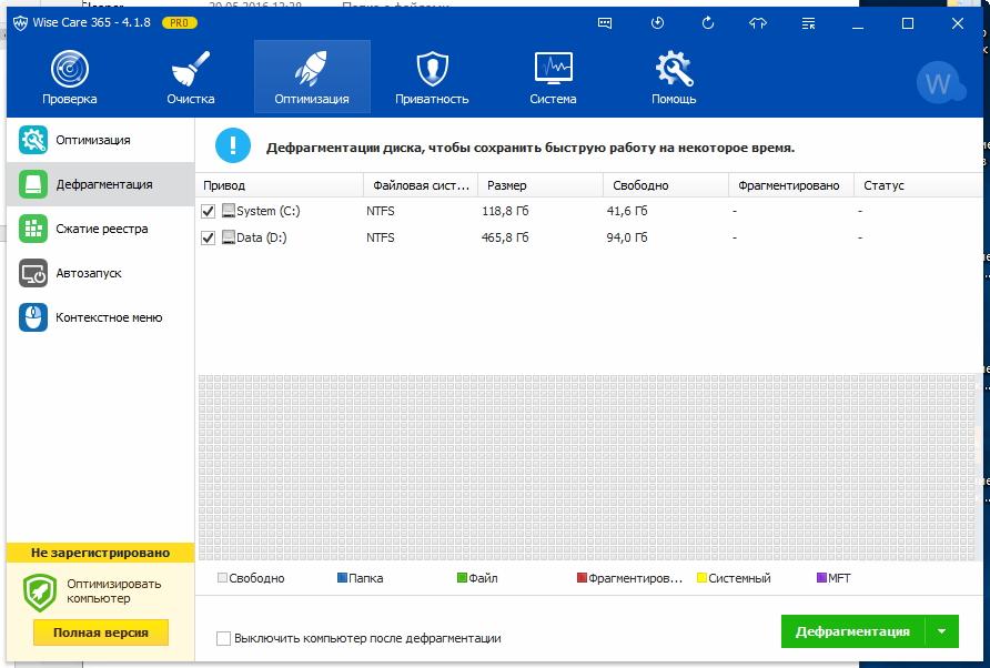 - Оптимизация системы. Бесплатная версия программы Wise 365 позволяет выполнить оптимизацию файлового пространства жесткого диска. Чтобы выполнить операцию, необходимо запустить скаченный сервис, найти поле «Оптимизация», кликнуть по строке «Дефрагментация» и подождать некоторое время, пока прога будет выполнять анализ системы. Также в разделе «Оптимизация» находится функция «Сжатие реестра». С ее помощью можно ускорить работу Windows.