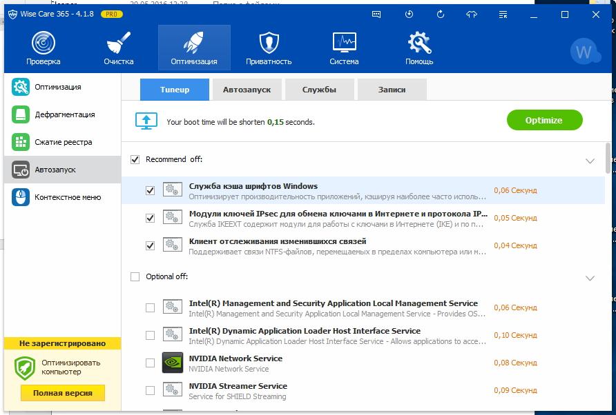 Обратите внимание, что некоторые оптимизированные элементы не вступают в силу, если вы не перезагрузите компьютер