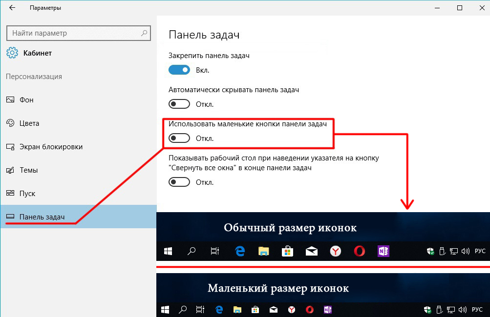 Для изменения размера иконок вам достаточно будет переключить одну кнопку в настройках: «Параметры»/«Персонализация»/«Панель задач»/«Использовать маленькие кнопки панели задач».
