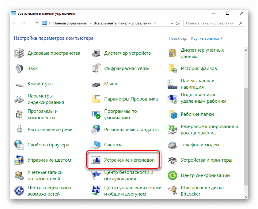 Далее запустите утилиту «Устранение неполадок» из открывшегося окна «Панели управления». Для более удобного поиска можете активировать режим отображения содержимого «Крупные значки».