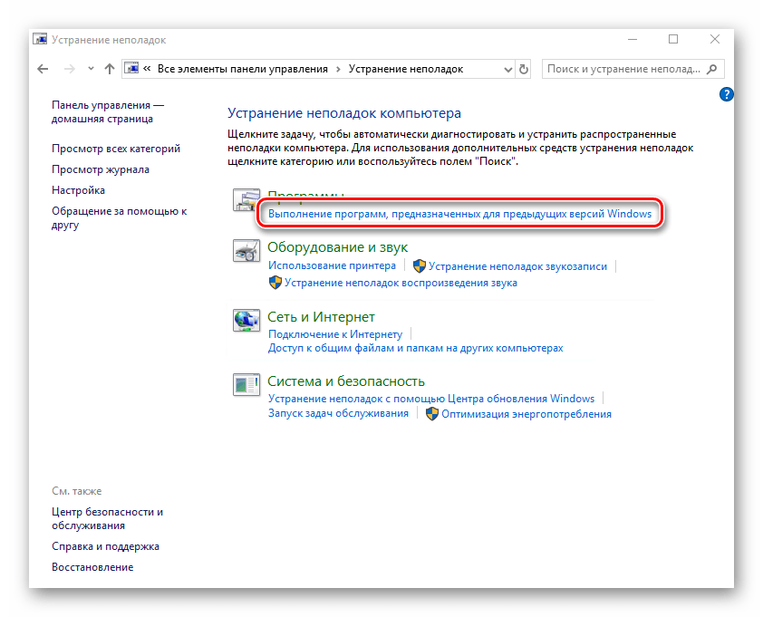 Дабы запустить режим совместимости, необходимо вызвать инструмент устранения неполадок, который в «десятке» называется «Выполнение программ, предназначенных для иных версий Windows». Вызвать средство можно через апплет «Устранение неполадок», расположенный одним из последних в Панели управления при визуализации ее элементов в виде значков, или через поисковую строку.