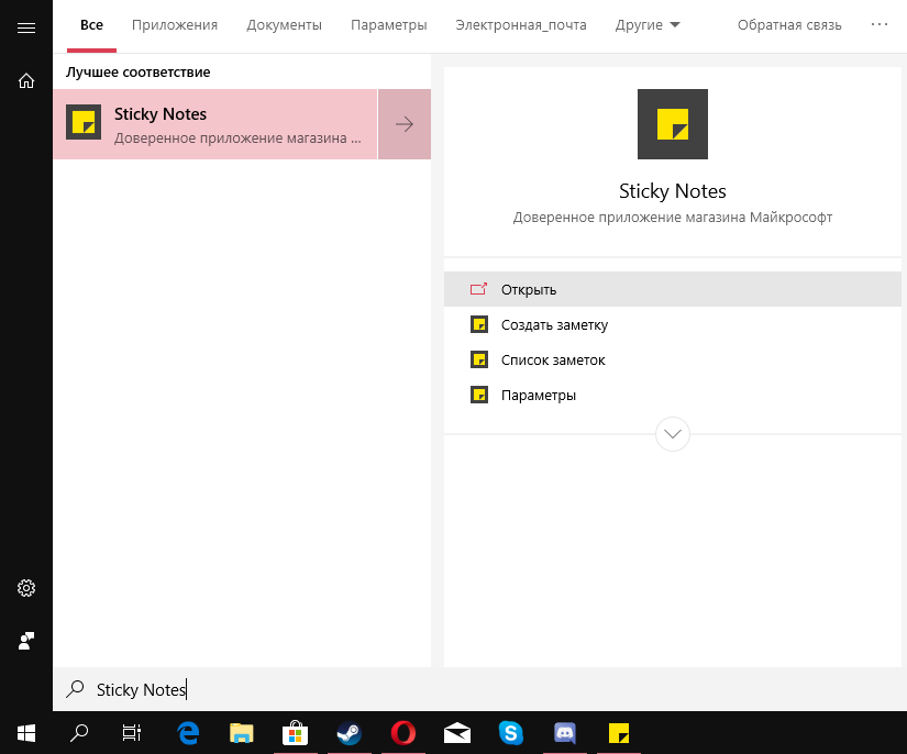 - Открываем поисковую строку на панели задач и пишем «Sticky Notes».