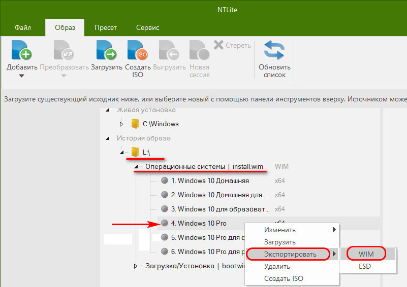 В окне NTLite увидим содержимое добавленного образа «install», выбираем нужную нам редакцию, вызываем на ней контекстное меню, выбираем «Экспортировать», затем указываем формат – WIM или ESD . В нашем случае это первый.