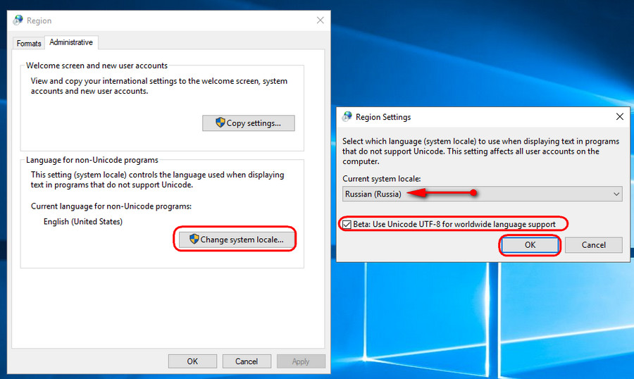 Жмём «Change system locale», выставляем «Russian», ставим галочку использования UTF-8. Кликаем «Ок».