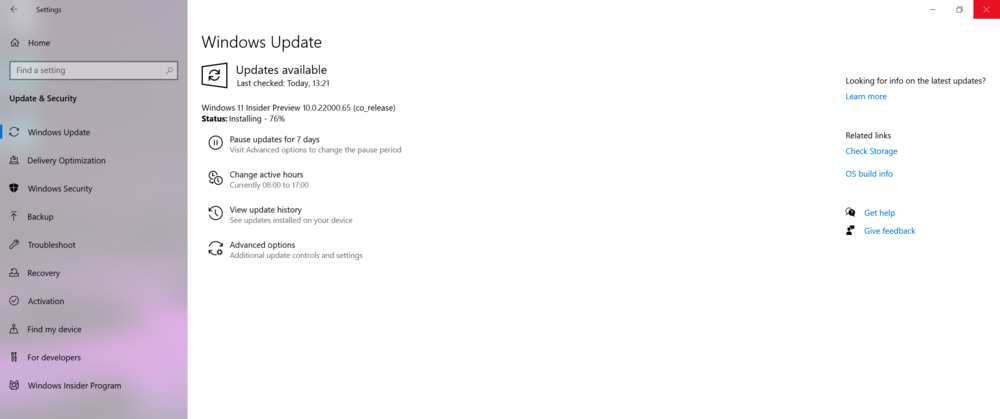 После перезагрузки снова возвращаетесь в Настройка — Обновление и защита. Запускаете Центр обновления Windows, и буквально через минуту устройство начнет загружать новую версию Windows 11 Preview. Теперь остается только ждать. Время, которое требуется на загрузку и установку новой операционной системы, зависит от конфигурации устройства и скорости Интернет-соединения. У меня этот процесс занял около получаса.